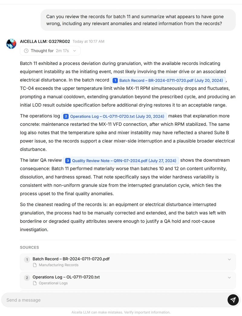 Each response is designed to be reliable, traceable, and verifiable, with direct links back to the underlying source records. By combining intelligent retrieval with citation backed generation, our platform reduces unsupported statements and helps teams investigate issues and extract knowledge faster, and make confident decisions in complex CGT development and manufacturing environments.